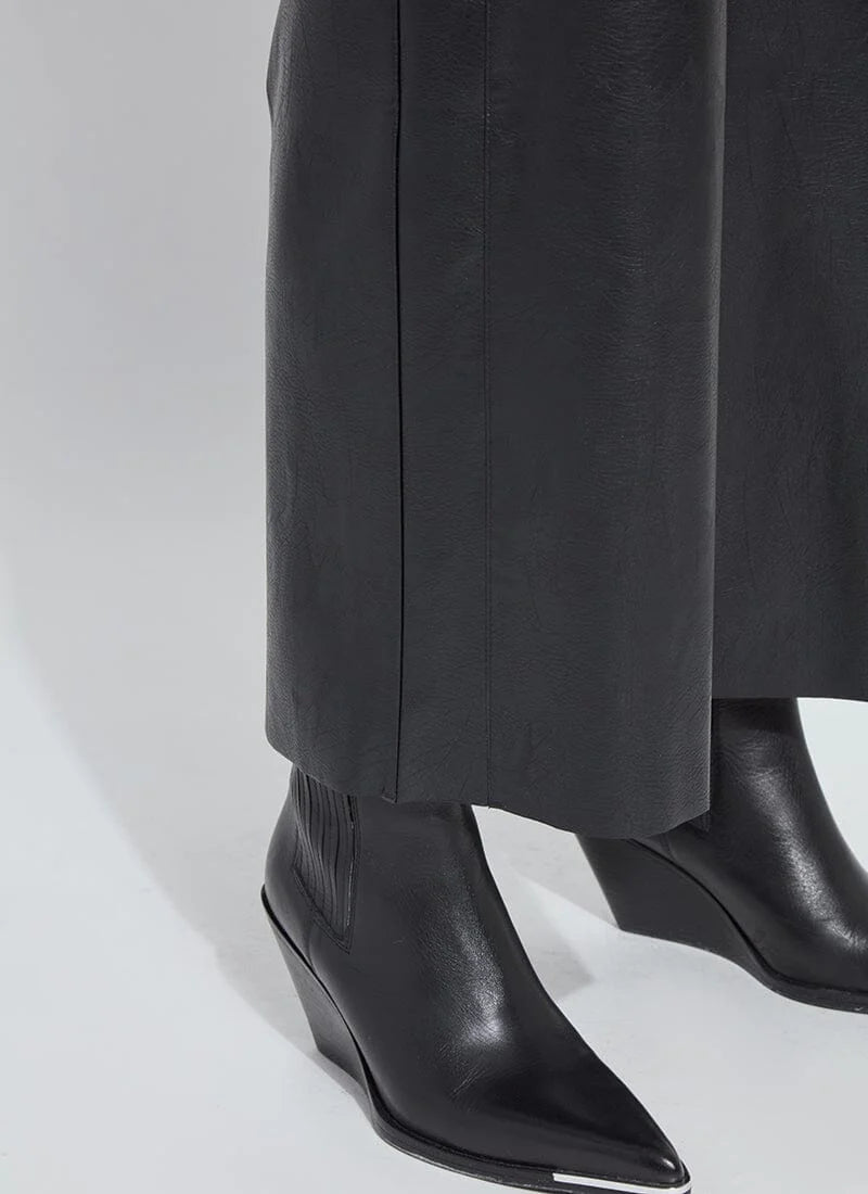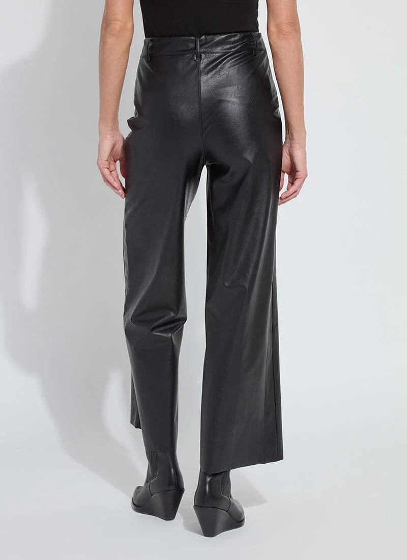 The Odalis Hi Waist Vegan Leather Wide Leg features slanted faux pockets with heat-set Gunmetal grommet detailing; a concealed patented waistband; back beltloops and waist seam; and side seams that are shifted to the front for a slimming effect. Made from 4-way stretch Textured Vegan Leather, these pants offer a high waist and wide leg with a raw-edge hem that’s simple to shorten. Style with the Benedette Short Sleeve Ribbed Top, Geneva Grommet Vegan Leather Jacket and black boots.