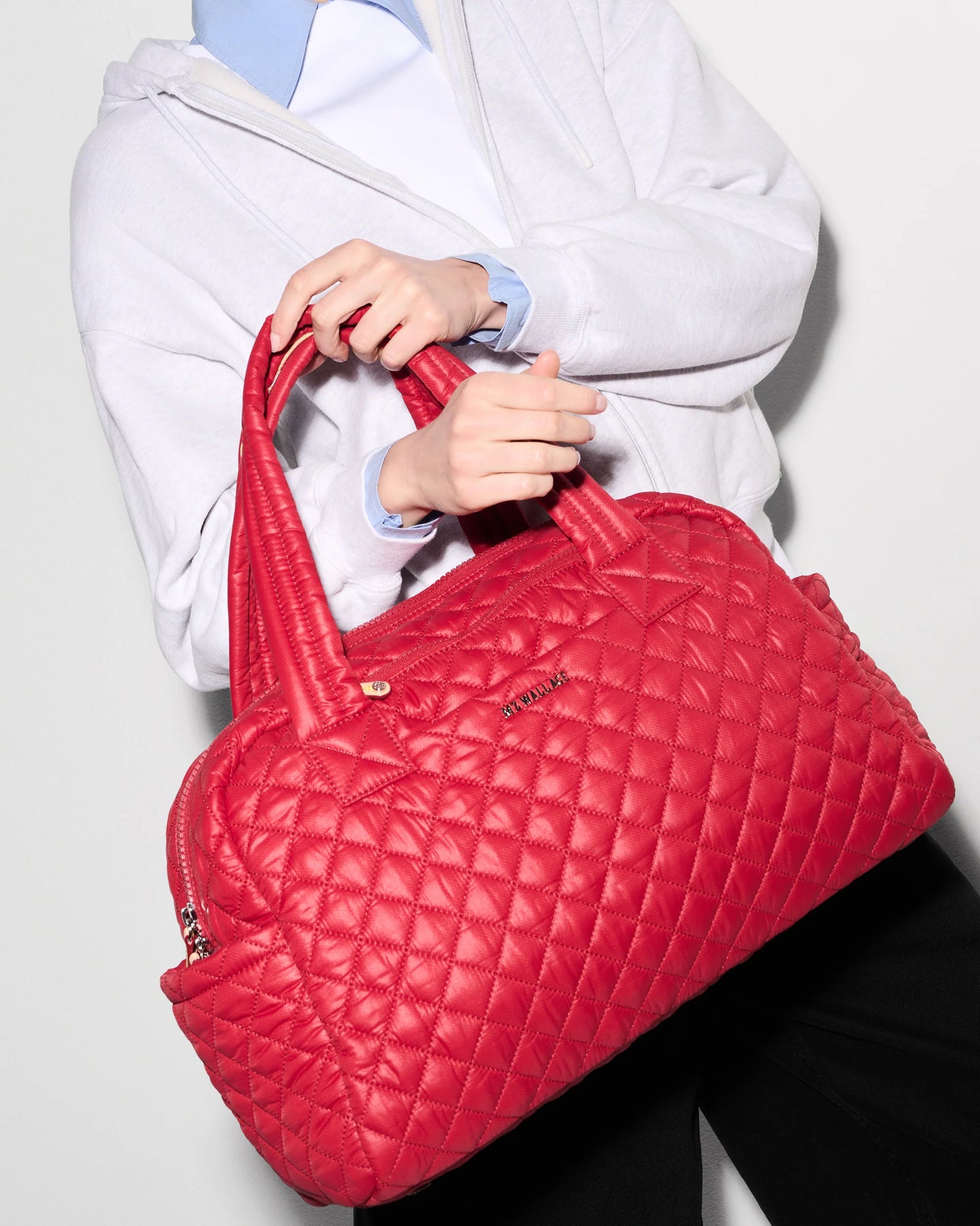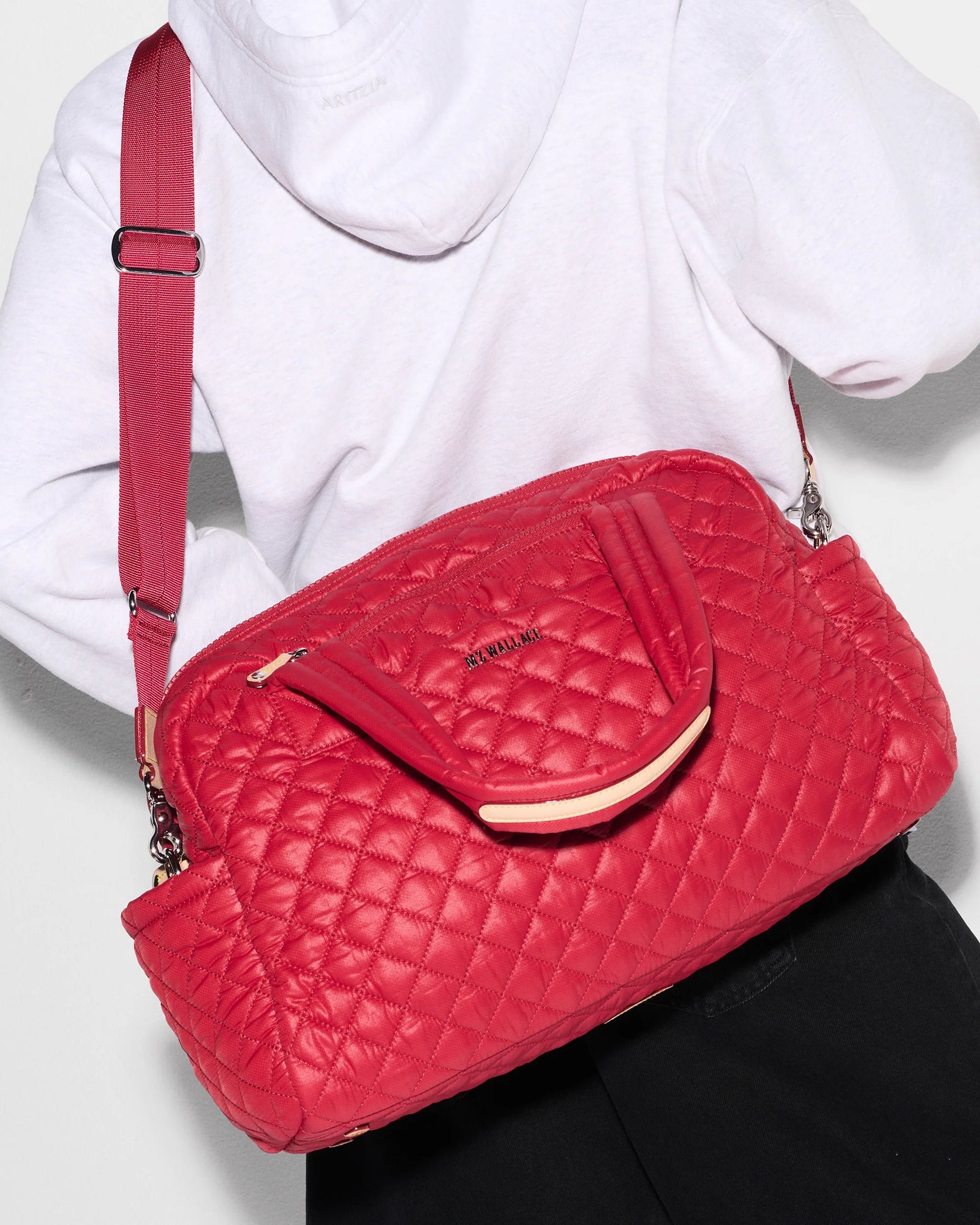 - Detachable, adjustable nylon crossbody strap