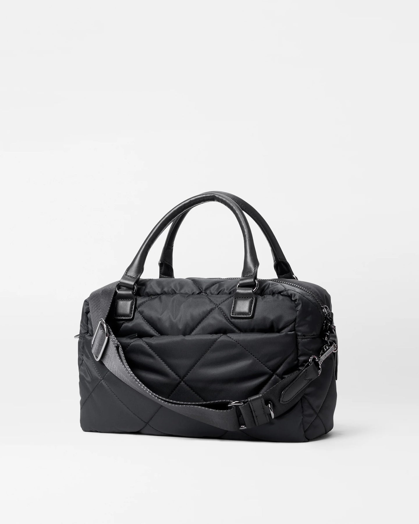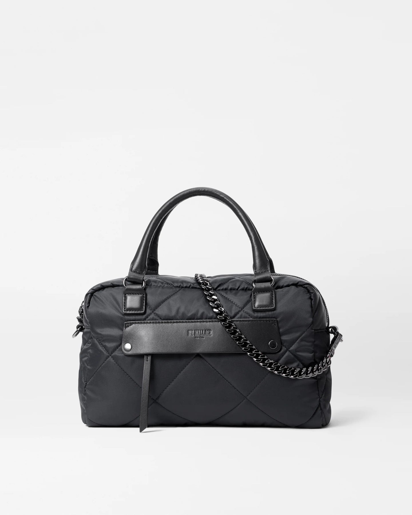 The Quilted Madison Satchel balances sculptural softness with quiet confidence, featuring rolled leather handles, a removable chain strap, and a secure zip-top closure. With multiple interior and exterior pockets plus a detachable pouch, it’s designed to keep everything in reach—and in style
