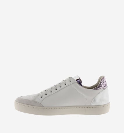 A combination of ecru, metal, split leather and glitter panels. Tonal laces to fasten. New this season, and already a winner!