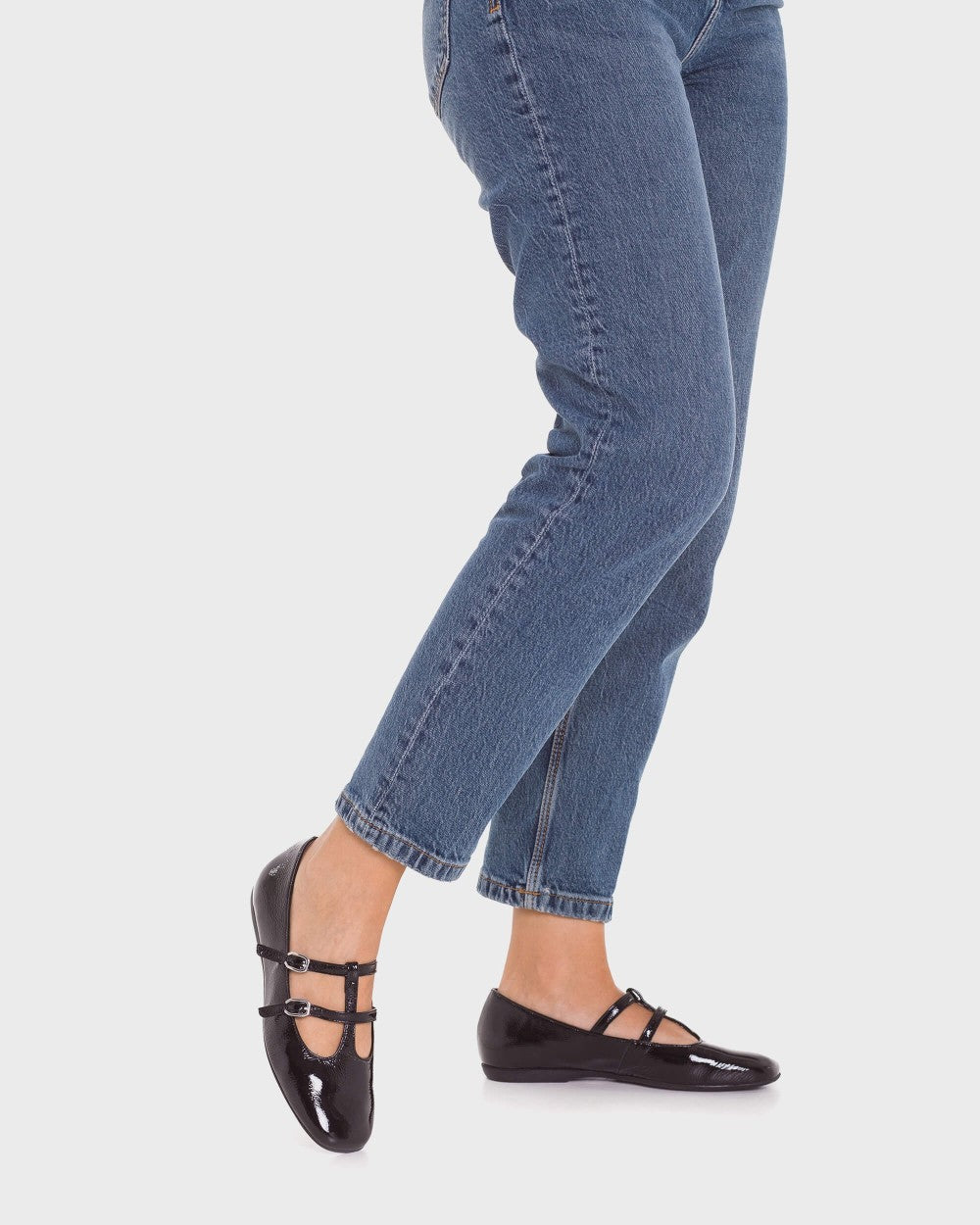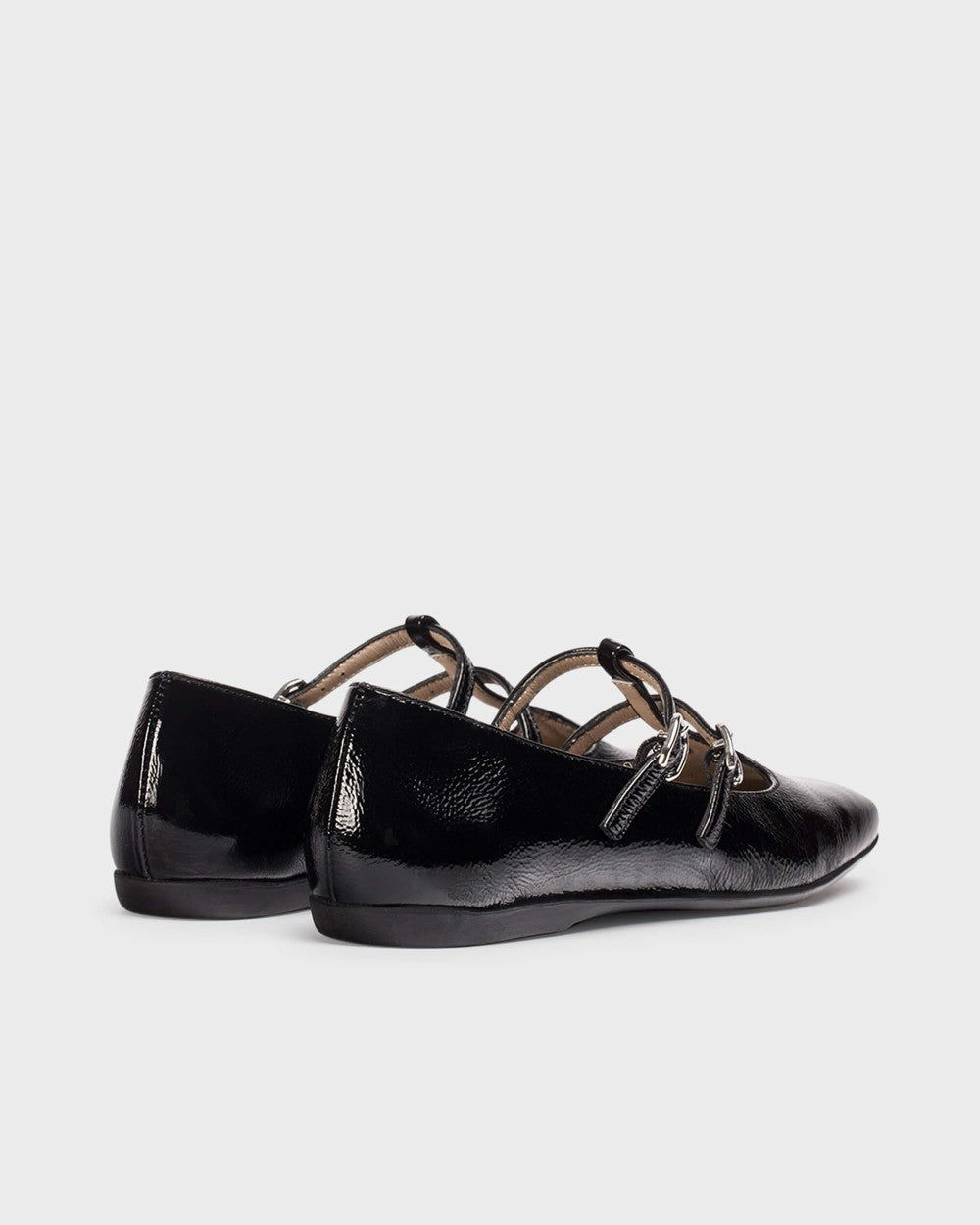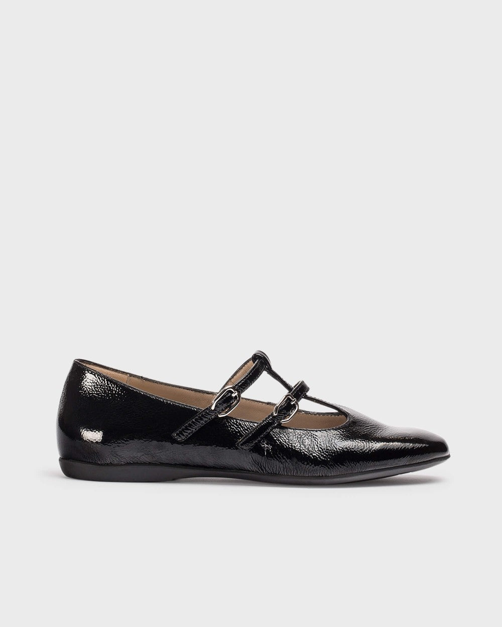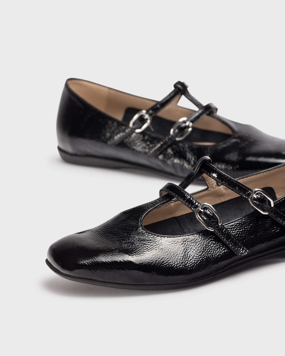 Regular price $215.00Mary Jane shoes PEPA 31 crafted in black patent leather. This feminine and contemporary style stands out for its double cross-strap design with metal buckles, providing an adjustable fit and a subtle retro touch. Its sleek silhouette and glossy finish make this model a versatile option to elevate any look with a distinctive flair. The MemoryGel insole ensures cushioned steps and maximum comfort throughout the day. #madewithloveinSpain. Wonders is committed to responsible manufacturing certified by LEATHERWORKINGGROUP.