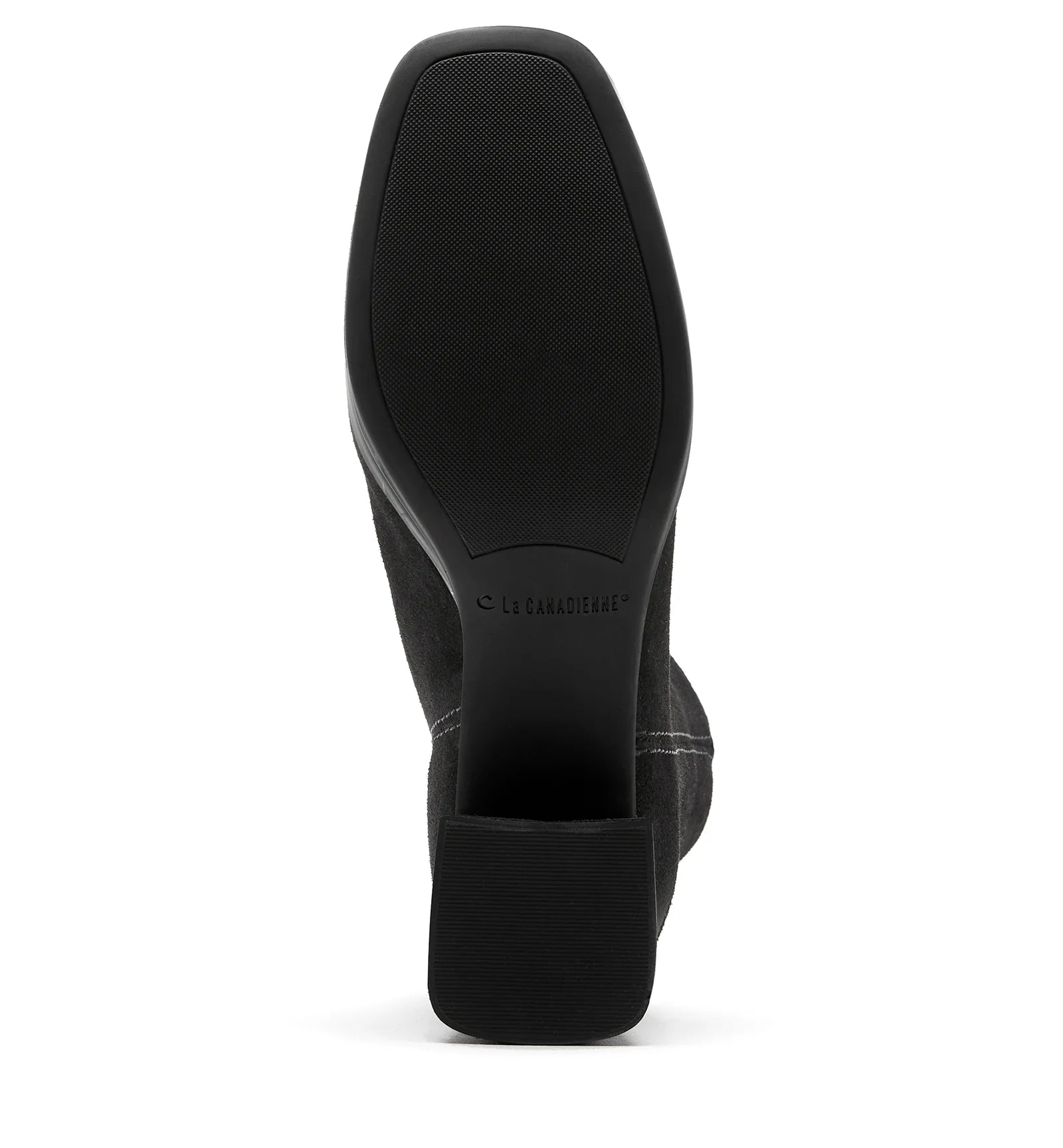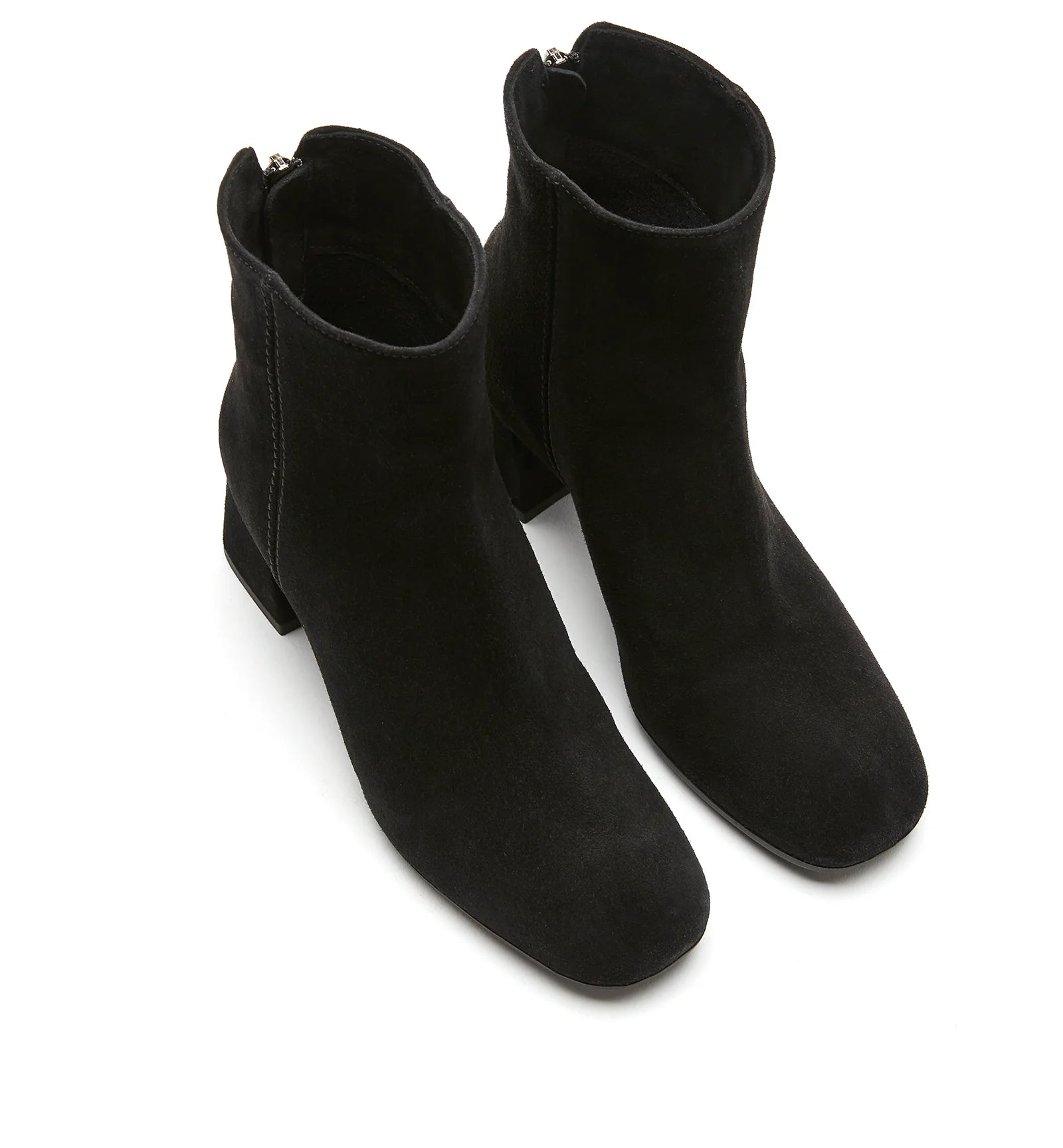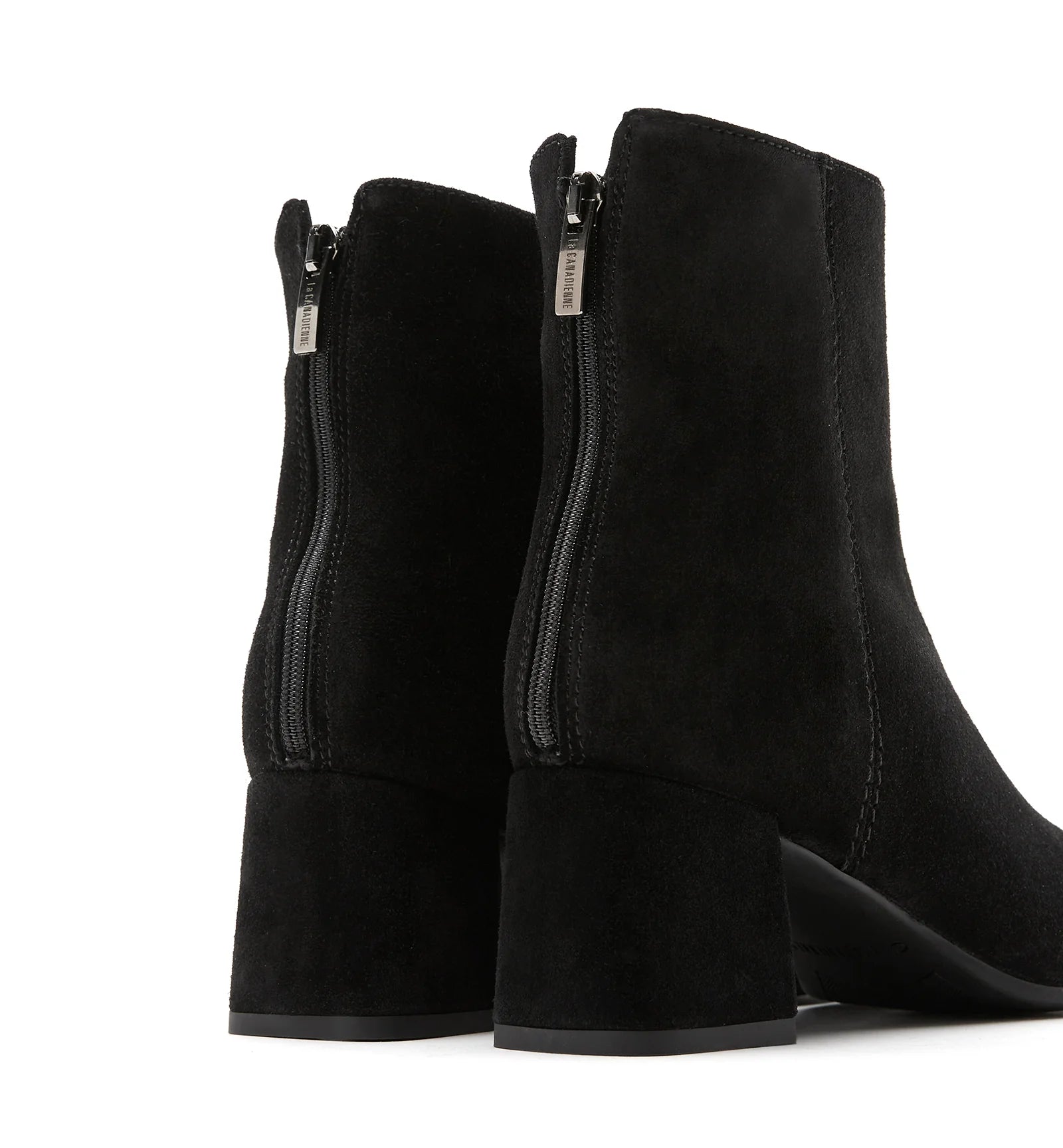 Crafted in soft suede, this ankle bootie features a square toe, low block heel, and a sleek back zipper. A minimalist silhouette designed for effortless, everyday wear.