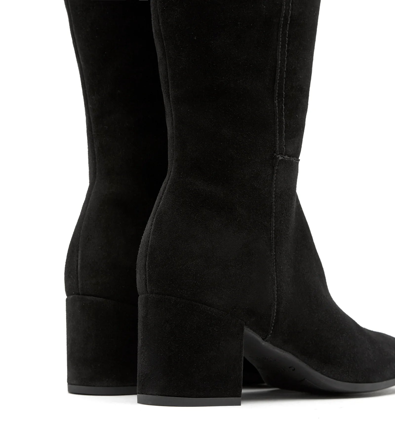 Knee-high suede boot featuring a rounded square toe, interior side zippers and an elastic inserts on the side.