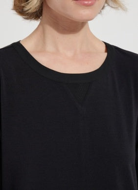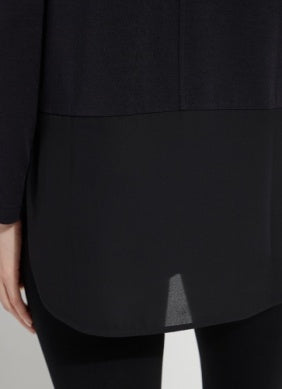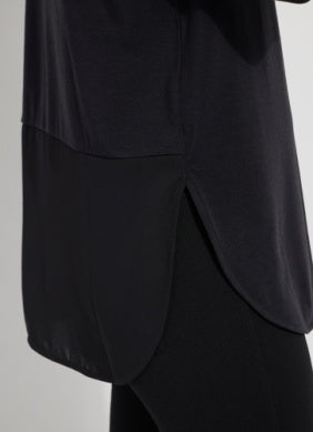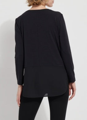 The Layla Mixed Media Top, an elevated, slightly slimmer tee, offers a stretchy Jersey body with a silky Georgette center back that doesn’t cling. Detailing includes a triangle detail at the neck, Georgette inserts at the collar band, and a high-low, legging-friendly hem. Partner the Layla Top with the Ankle Denim Baby Bootcut pants and Amelia Moto Jacket.