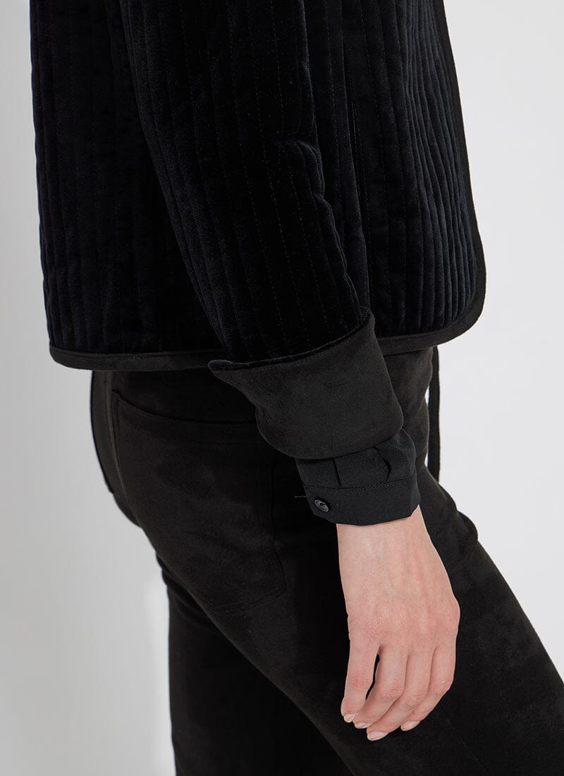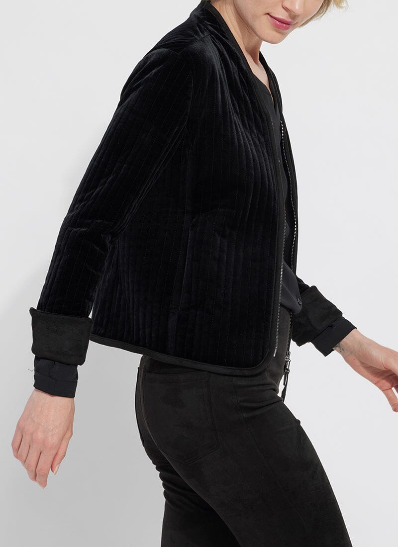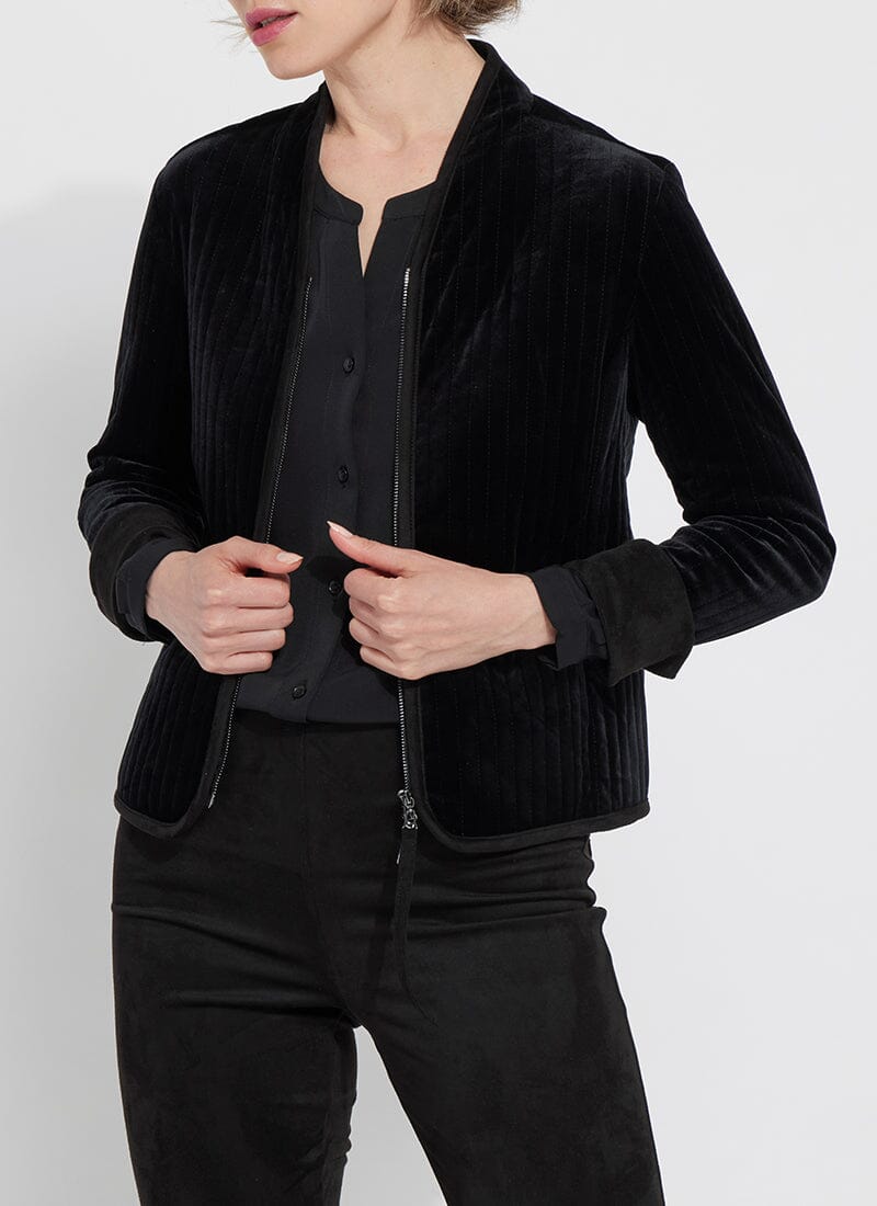 The 2-way stretch Scarlett Quilted Velvet Jacket is made from a machine washable Quilted Velvet fabric with a vertical line pattern. Warm and soft, this cropped jacket is trimmed in Black Vegan Suede and features a double-pull zipper, side pockets and sleeve vents above the wrists for easy cuffing. For a casual look, pair the Scarlett Quilted Velvet Jacket with our Baby Bootcut pant in Knit Denim, or for a dressier style, wear it with our Jesse Vegan Suede Baby Boot pant.