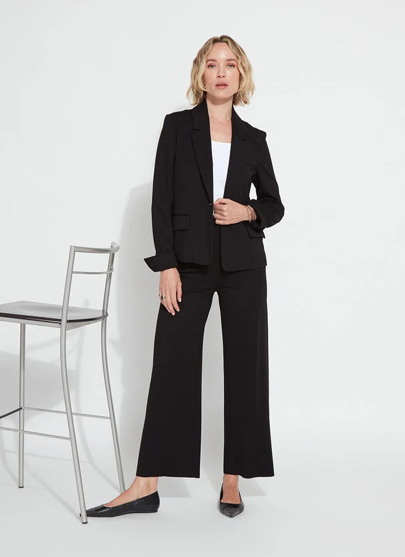 The Raya Lightweight Ponte Blazer features slim sleeves with wrist slits for easy cuffing, menswear front pockets, a front left welt pocket, faux horn buttons and back vent. Made from a transitional Lightweight Ponte, the Raya Blazer does not have shoulder pads; offers a Satin inner lining along the front panels and an unlined back panel with contrast color Satin binding; features 4-way stretch fabric for comfort; and is machine washable. Style the Raya Lt. Wt. Ponte Blazer with the Essential Tank and sneakers. This blazer also complements bootcut and wide-leg pants.