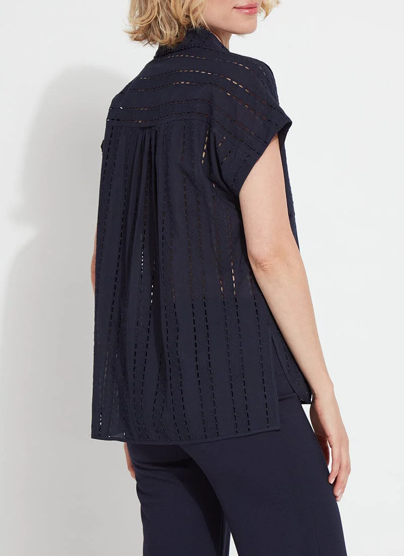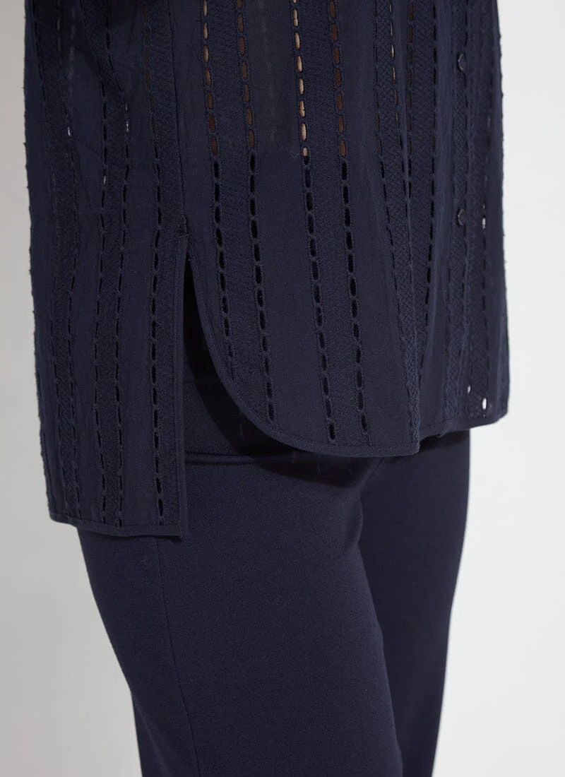 The Cornet Cotton Eyelet Shirt, made from a lightweight Cotton voile with eyelet embroidery detail, features drop shoulders, pearl eyelet detailing on the collar and center front of the top, a back yoke with loop, and solid fabric facing. A diagonal seam along the front of the top is made with inserted eyelet and the hem offers a rounded front that’s easy to tuck. The Cornet Cotton Eyelet Shirt, which is impeccably finished with solid binding, layers perfectly over our Essential Tank. Style it as a jacket or top with wide-leg pants.