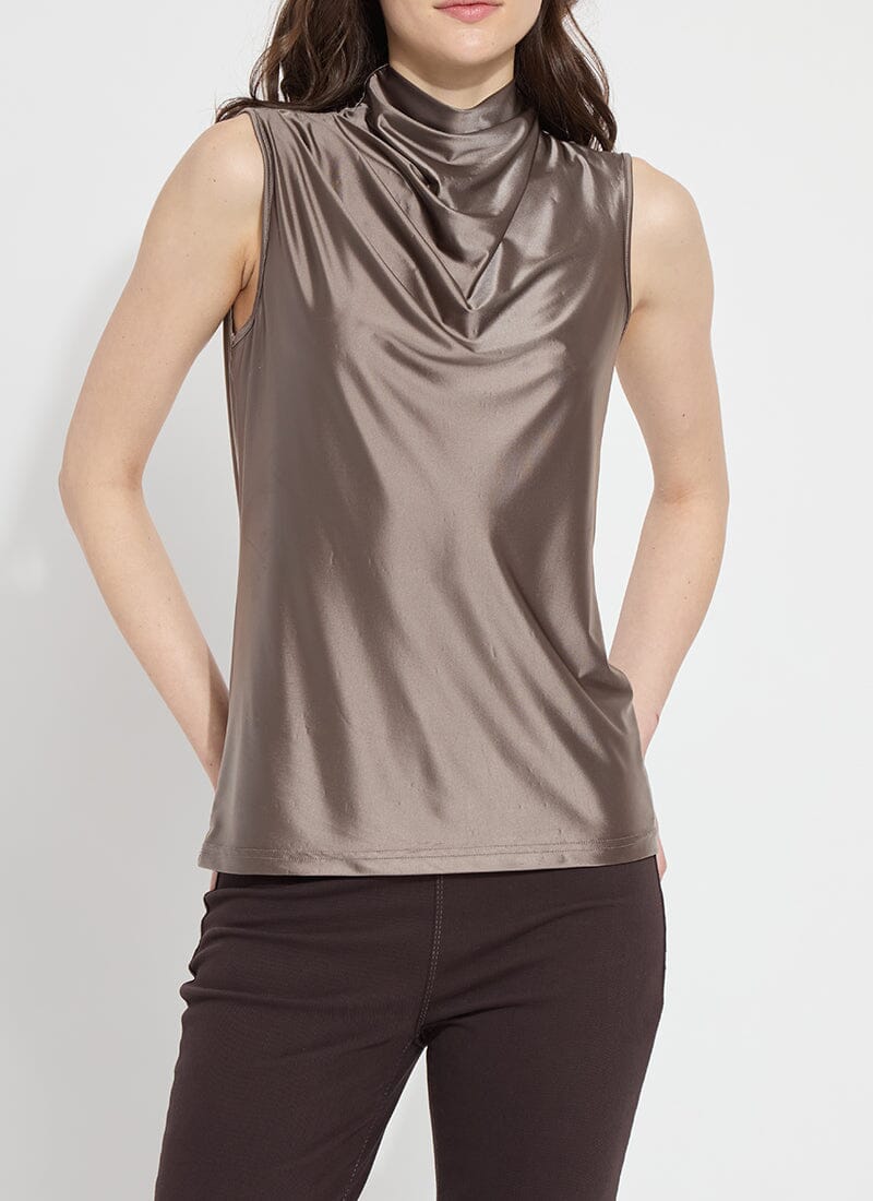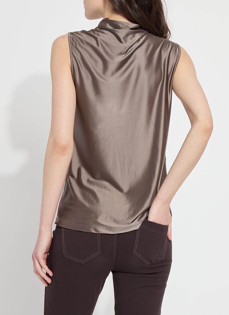 Made from wrinkle-free Stretch Satin Jersey, the sleeveless Irina Satin Jersey Turtleneck Top showcases a mock neck and front drape. Made from Stretch Satin Jersey, the fitted Irina Turtleneck coordinates well with our Aubrey Vegan Suede Blazer, Livia Crop Pant and black mules.