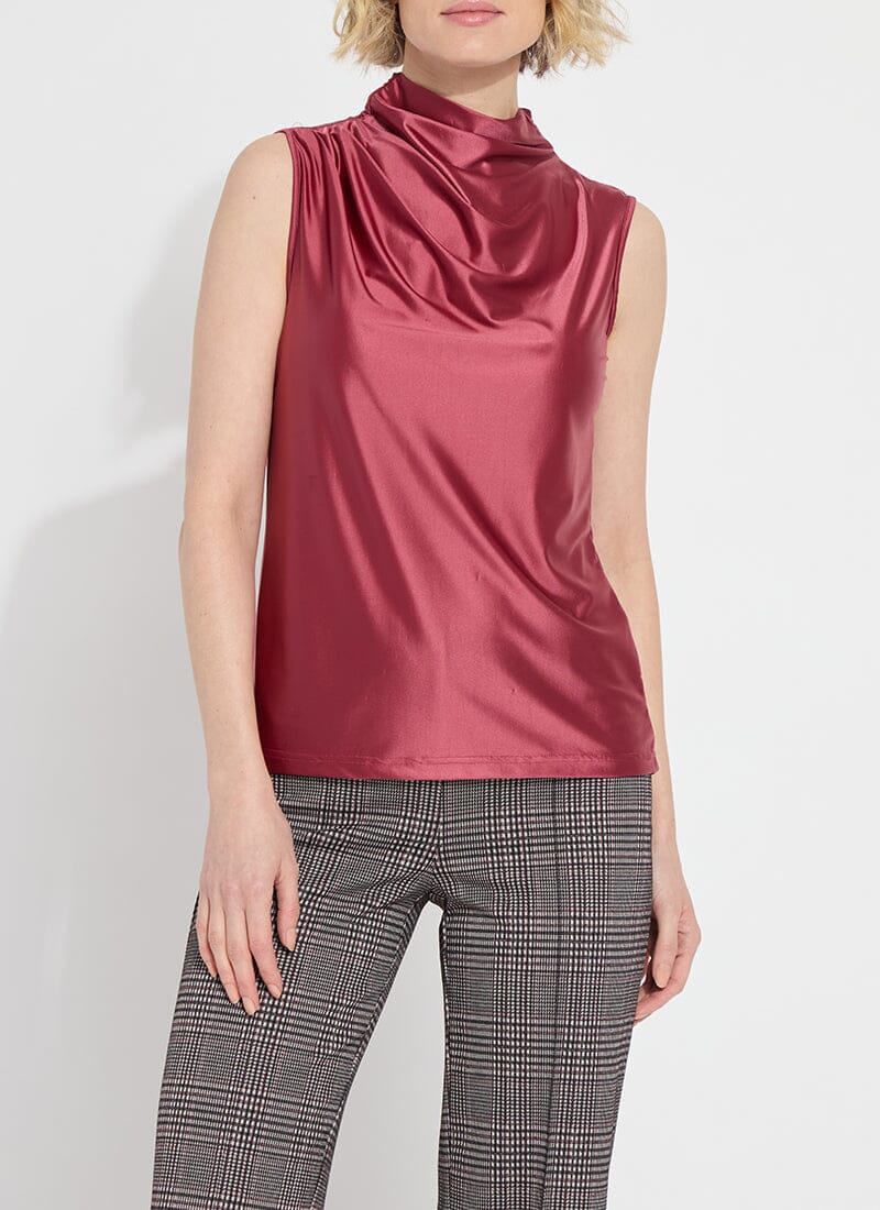 Made from wrinkle-free Stretch Satin Jersey, the sleeveless Irina Satin Jersey Turtleneck Top showcases a mock neck and front drape. Made from Stretch Satin Jersey, the fitted Irina Turtleneck coordinates well with our Aubrey Vegan Suede Blazer, Livia Crop Pant and black mules.