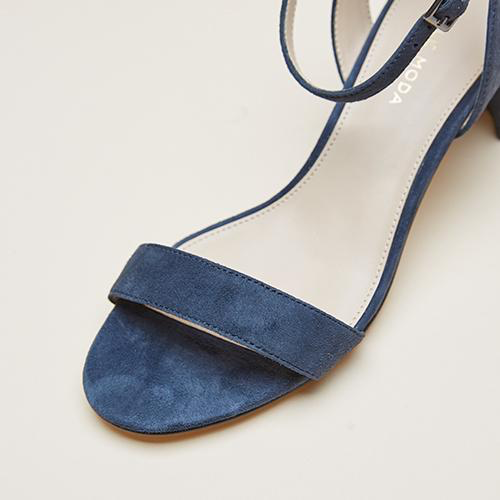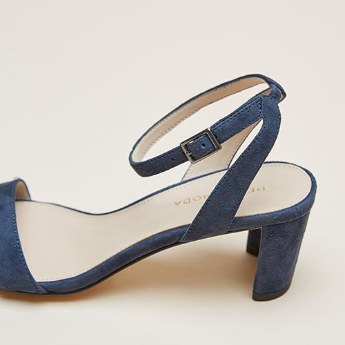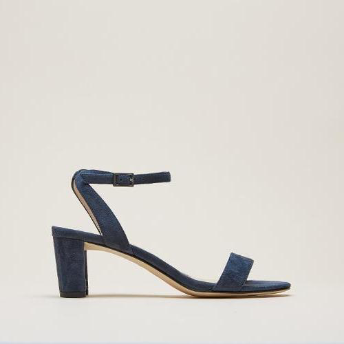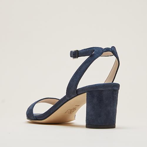 A sandal sitting on a low block heel covered in smooth suede with an ankle strap for closure. Perfect day into night comfort heel.