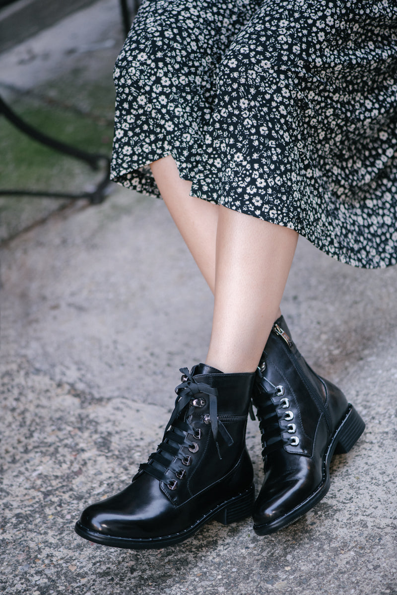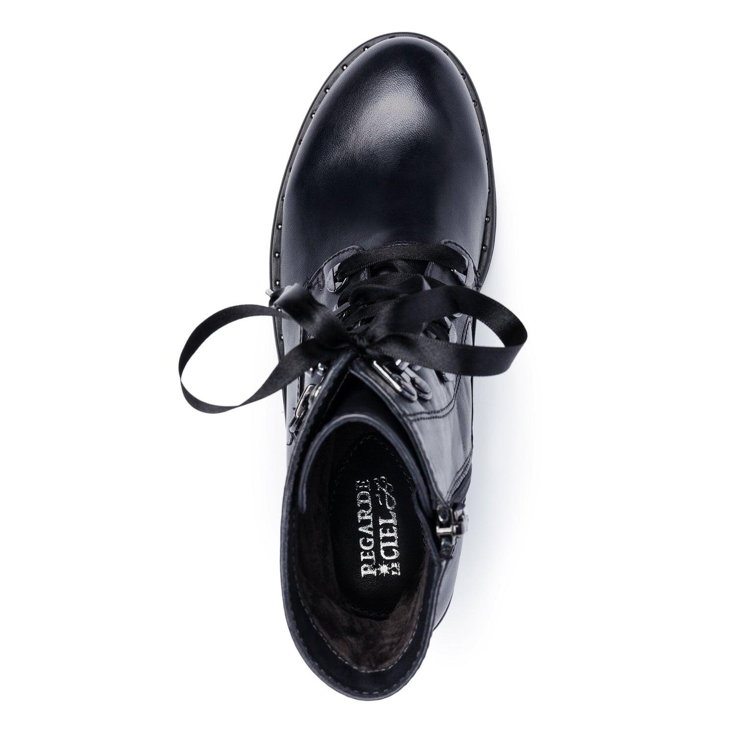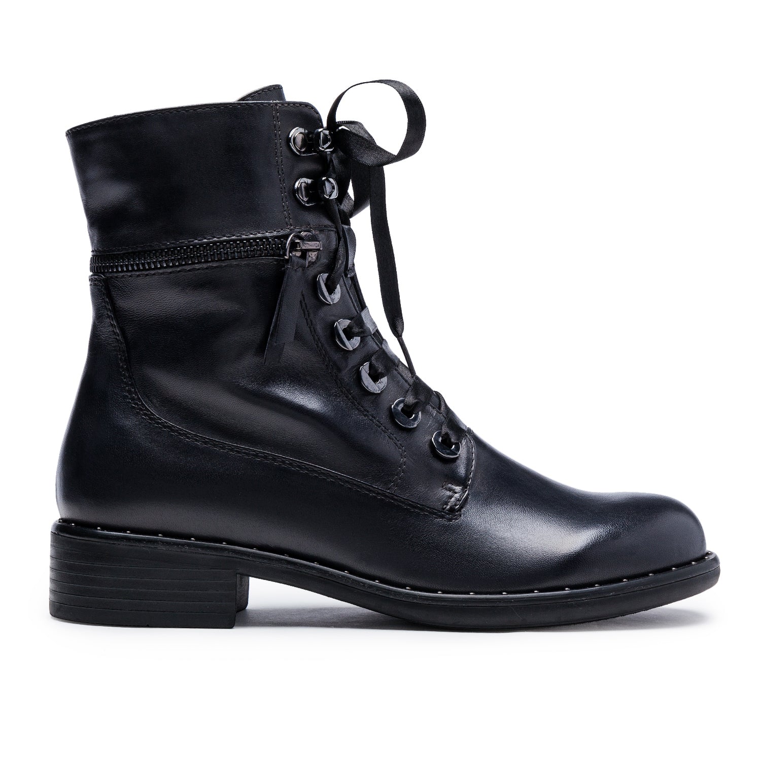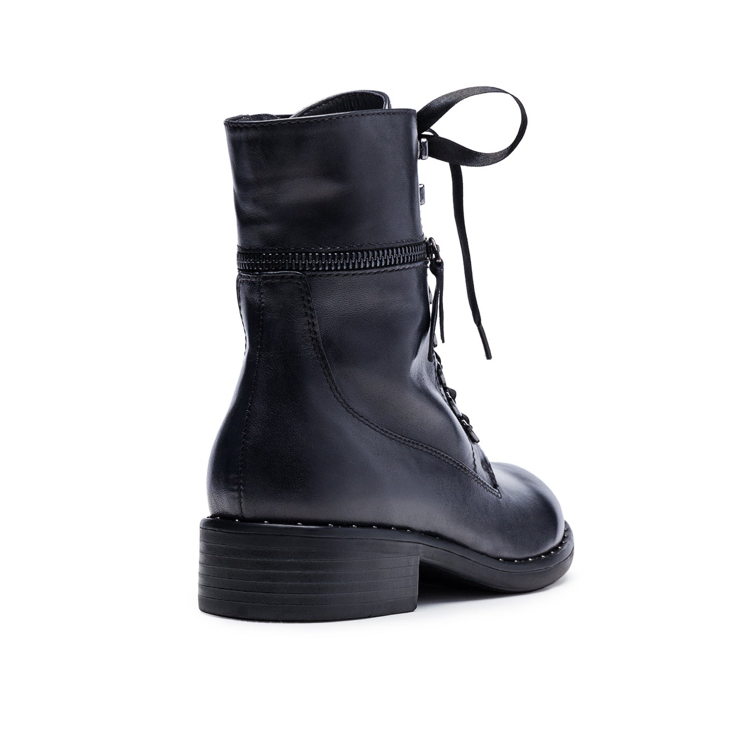 Composition: Delice Leather in Black Lining: Fully lined, short hair fur, velvet. Heel Height: 35 mm, rubber sole. Logo : Logo on the metal zip puller. Sole: Rubber Sole. Fastening: Interior zipper and velvet laces. Details: Interior zipper, velvet laces, studs and metal-gun hardware. Stitching: Accentuated stitching. High-density foam and instant-forming memory footbed.